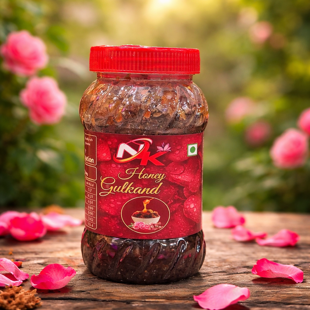 Gulkand Honey combines the natural richness of pure honey with the delicate sweetness and aroma of premium gulkand (rose petal preserve). Carefully blended to preserve the authentic qualities of both ingredients, this infusion offers a smooth, floral taste experience along with natural wellness benefits. The honey provides a thick, velvety texture, while gulkand adds a subtle rosy fragrance, gentle sweetness, and a pleasant flavor profile.